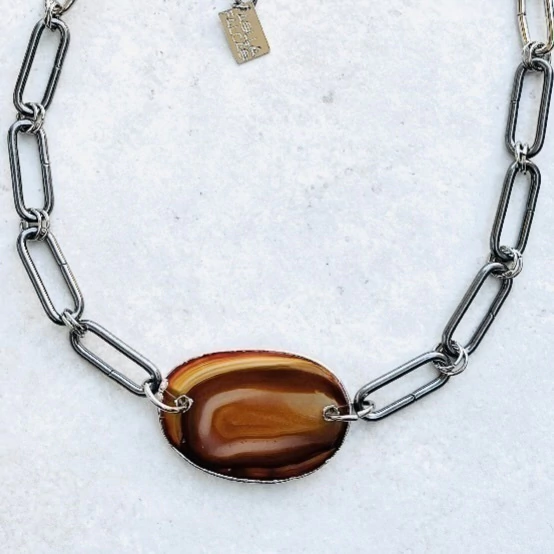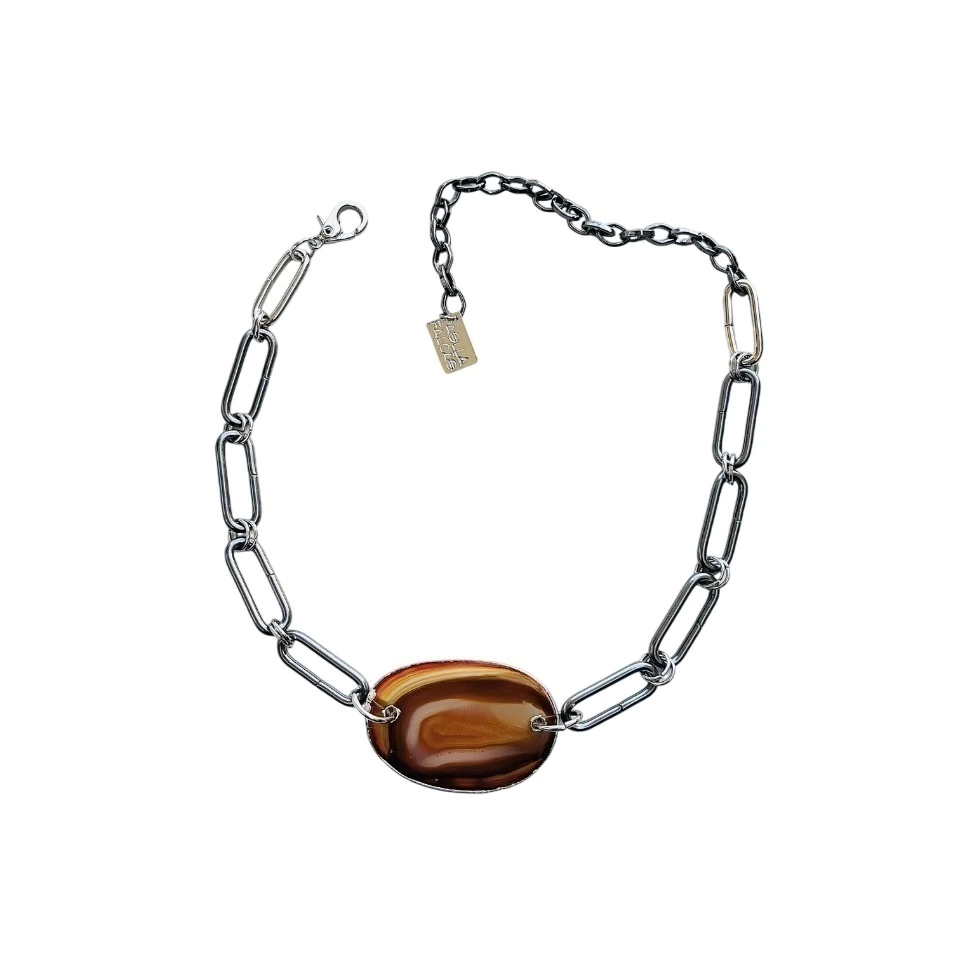 Colar em latão com banho e chapa de pedra ágata.